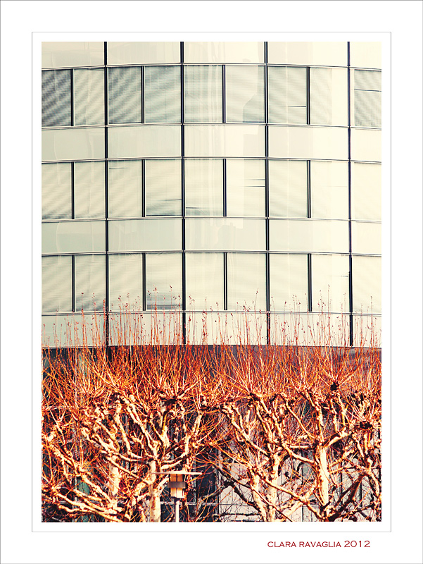 l'edificio propone una sottile grafica ed una elegante composizione geometrica..le chiome regalano un bel diversivo all'incisivo rigore della struttura...la parte sottostante non riesco ad apprezzarla...ma sicuramente è un mio limite...non ti nascondo che avrei tagliato poco sotto le chiome....