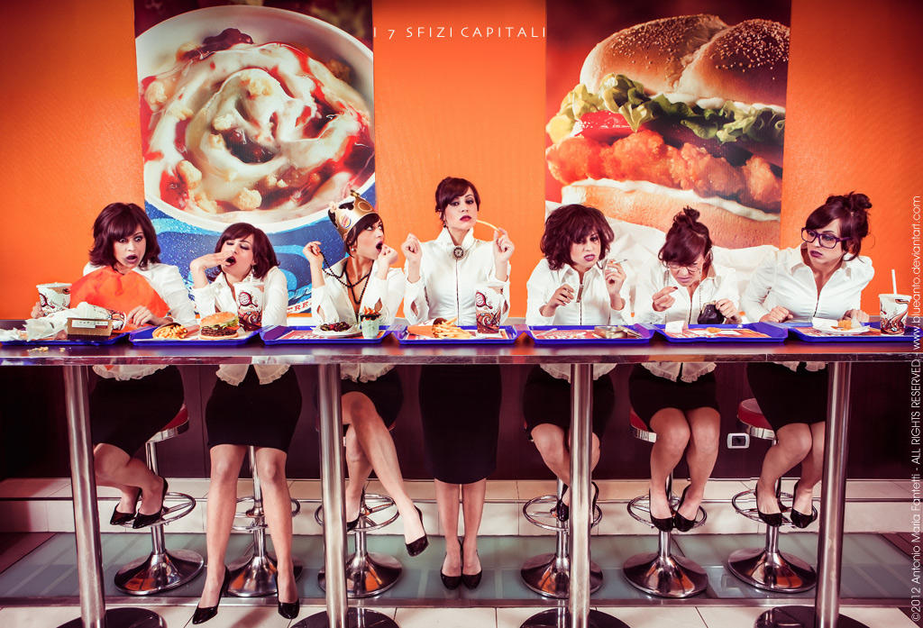 bhe la scena è stata ambientata nel burger king al centro di Bari per due motivi, il primo è che volevo contestualizzare la cosa, non avevo voglia di ambientarla in un salotto asettico o concettuale, secondo cercavo un tavolo abbastanza lungo per le 7 modelle