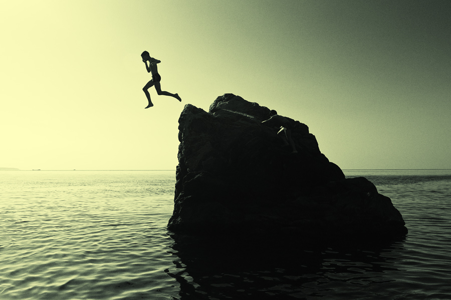 Vado sicuramente contro corrente al mio credo suggerendo un bel bianco e nero.... ma il valore dello scatto sta nella sagoma sia del tuffatore che dello scoglio ( e forse allora capisco il perchè del secondo ragazzino "nascosto") soli a dover sfidare l'immensità del mare...