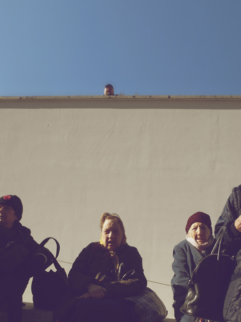 dalla minuta, sembrava una guglia, quasi disturba la composizione (IMHO), non é molto a fuoco, mentre trovo molto interessanti i visi delle persone, intendo le bocche e i segni sul volto, con lo sfondo del muro che sembra un telo fotografico da sala posa.