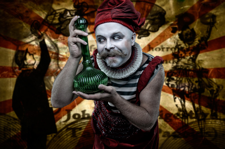 Mi piace questa fusione un po' alchemica, un po' circense, pur non conoscendo il personaggio e la parte di postproduzione, per cui credo si addica al meglio anche il fondale, dall'idea del "retroiluminato"... in gamba, mi piace il risultato finale  |