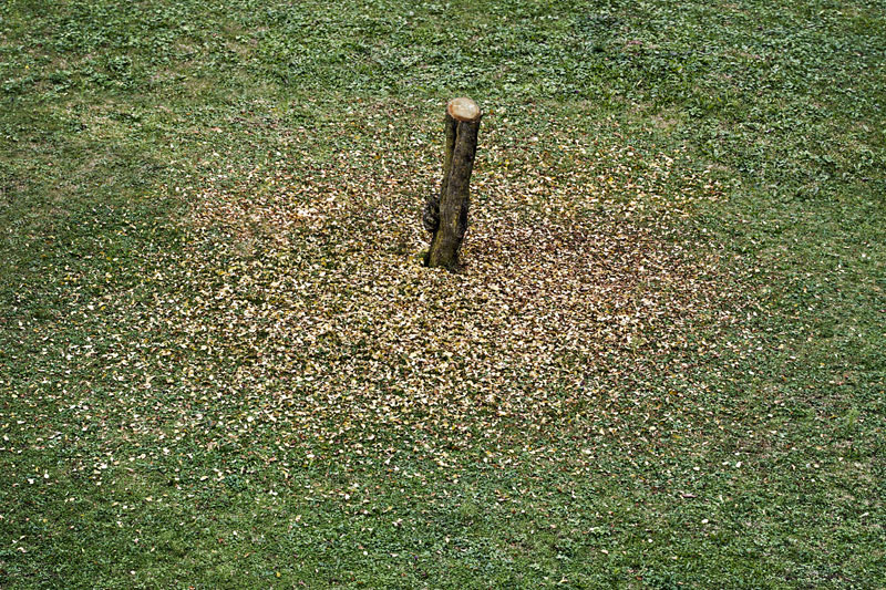 mi da l'idea di una scena del crimine, i trucioli di legno come sangue, il tronchetto dell'albero come vittima..messaggio crudo, amaro con un forte sapore ironico!!