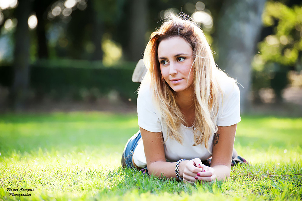 :)buona la composizione e, vista anche la presenza di tutto quel verde, discreta la gestione del colore. anche l'esposizione, seppur con zone di alteluci ben oltre il limite della gamma, mi sembra funzionale a creare un certo tipo di atmosfera. peccato per quel piede che spunta oltre la spalla dx di lei e che rovina un po' la resa d'insieme.