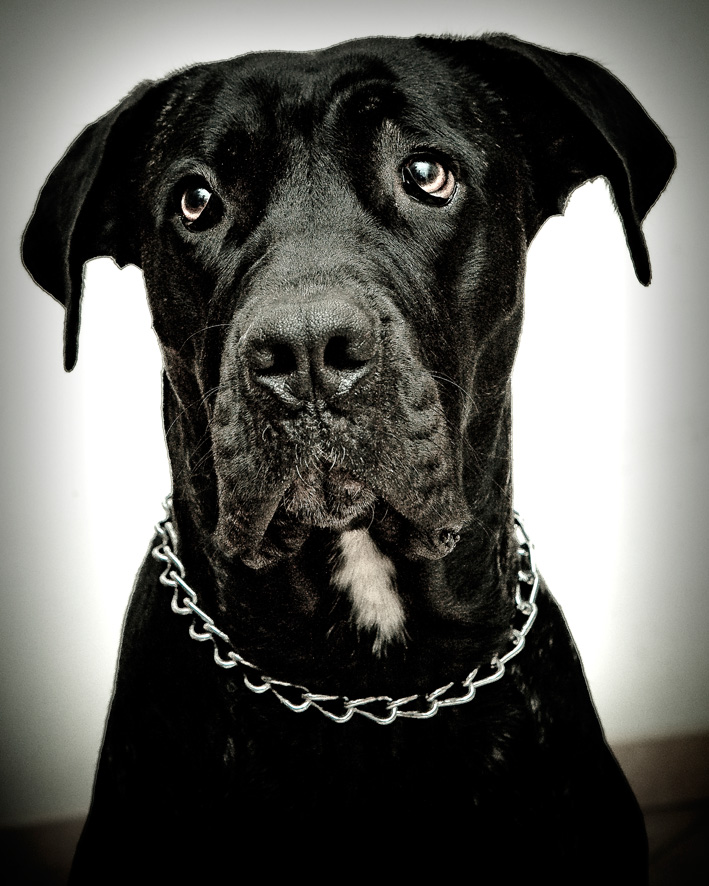 Mi piace insomma quella particolare dolcezza che lo scatto coglie nello sguardo del cane, svolgendo il racconto del "ritratto" (che non dimentichiamolo mai è prima di tutto una espressione di giudizio da parte di chi scatta) sul contrasto tra una certa idea di forza che rievoca quel tipo di cane (idea rafforzata dallo stesso robusto collare a catena) e la tenerezza disarmante di quegli occhioni da cucciolo.