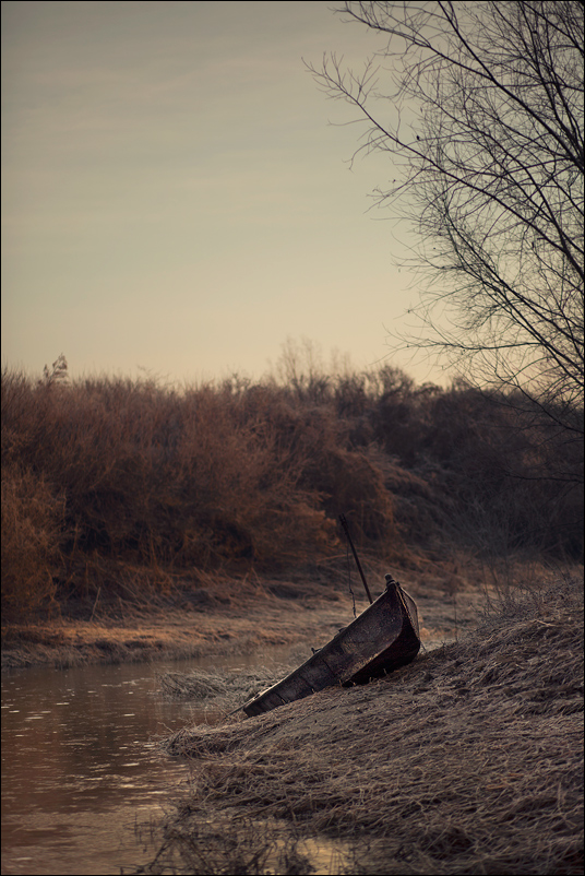 Un'immagine che si avvale di una densa atmosfera e di una luce che ne impreziosisce ogni dettaglio, dalle frasche, al profilo della barca e la superficie dell'acqua... Molto bella nel suo abito malinconico.