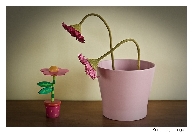 Piacevolissima ambientazione con i fiori che scruttano (pare con scetticismo) questo piccolo "alieno"