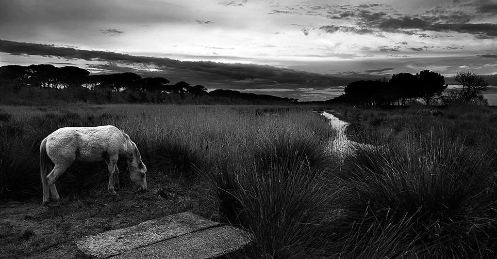 Bravo Franco! Con queste dimensioni è nettamente meglio: si apprezza il bel b/n, l'atmosfera bucolica, lo scorrere del fosso di campagna in controluce che porta alla pineta sullo sfondo ed il meraviglioso cavallo bianco in pp. Il cielo, con la sua trimensionalità e le sue sfumature di bianchi e neri, completa il bel quadro.
