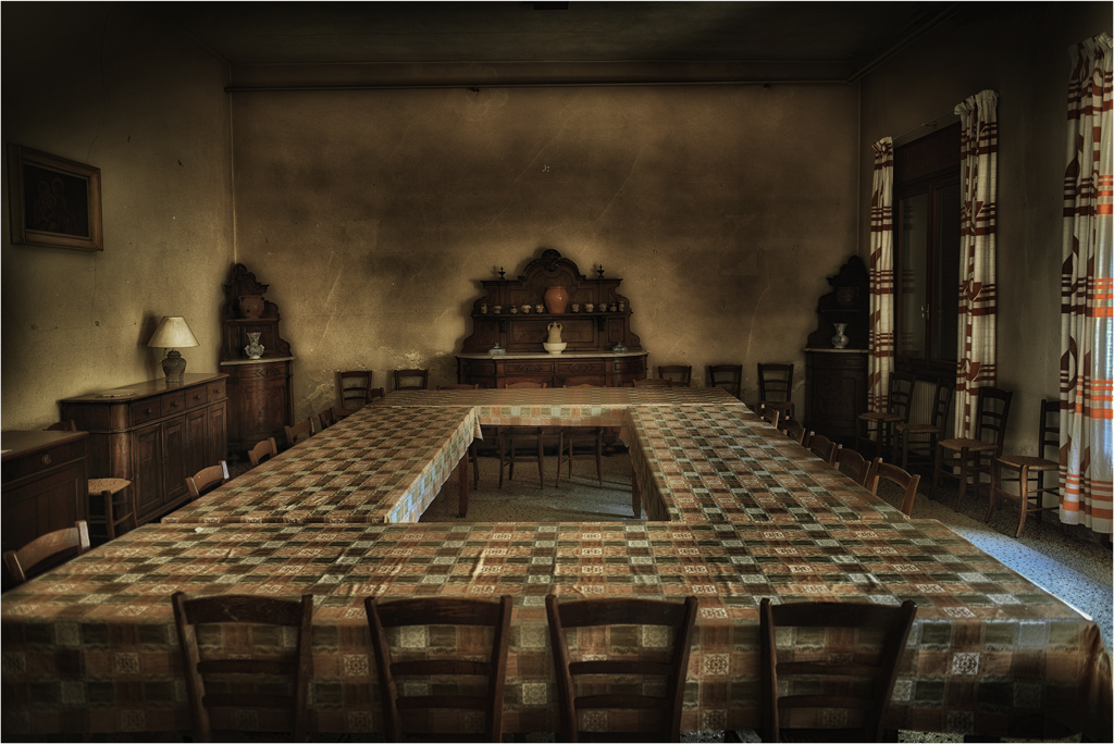 Una immagine che racconta di vecchie cascine, di famiglie numerose in festa, di grossi caminetti accesi a riscaldare gli ambienti...la mancanza assoluta di persone e la regolare disposizione delle sedie e degli arredi, suscitano peraltro l'idea di una atmosfera sospesa, quasi congelata, in cui il disuso ha ormai preso il sopravvento ed anche le tonalità sono funzionali al racconto all' immagine...