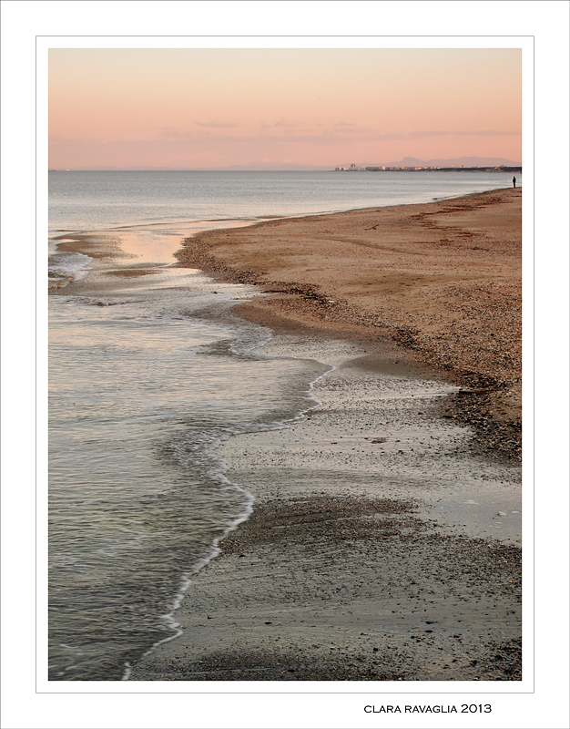 Bellissima la ruvida battigia che si scioglie nel rosa cipria ripreso dal cielo e dalla puntinatura delle piccole case sullo sfondo.