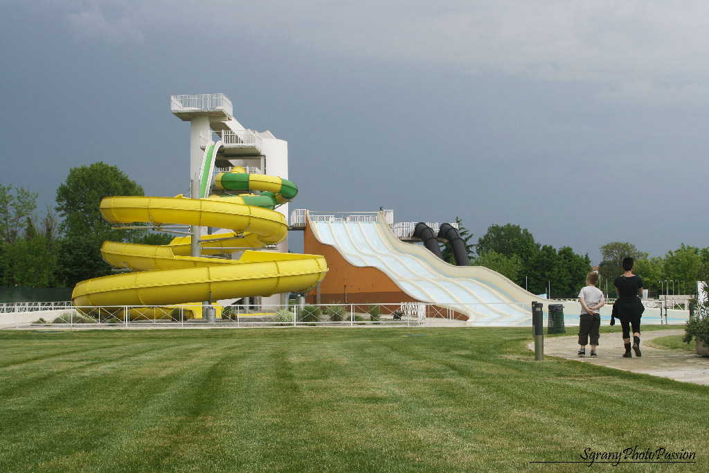 In attesa della gara di nuoto di Nicolò abbiamo girovagato per questo parco acquatico non ancora in funzione. Mattia, comminando, iniziava ad ammirare ed a gustarsi la vista degli scivoli presenti.