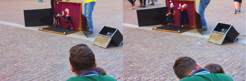 Magari un'inquadratura verticale ti permetteva di mostrare la scena per intero: la coppia (almeno con tutta la schiena paterna) in primo piano (a fuoco, dato che è il punto di interesse) e il marionettista sullo sfondo (non solo le gambe). Tra i due scatti, quello a dx mi pare mostri meglio il rapporto padre/figlio.