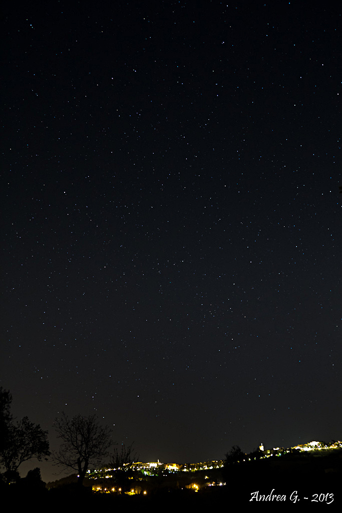 ...però, da recanatese DOC, innamorato della mia città, avevo proprio voglia di riprendere quel particolare profilo del paese sovrastato da un grande cielo stellato (quello che vedete è detto il "versante leopardiano"... per chi conosce il posto si possono intravedere, da sinistra, il campanile della cattedrale, la torre del borgo, il colle dell'infinito...).
