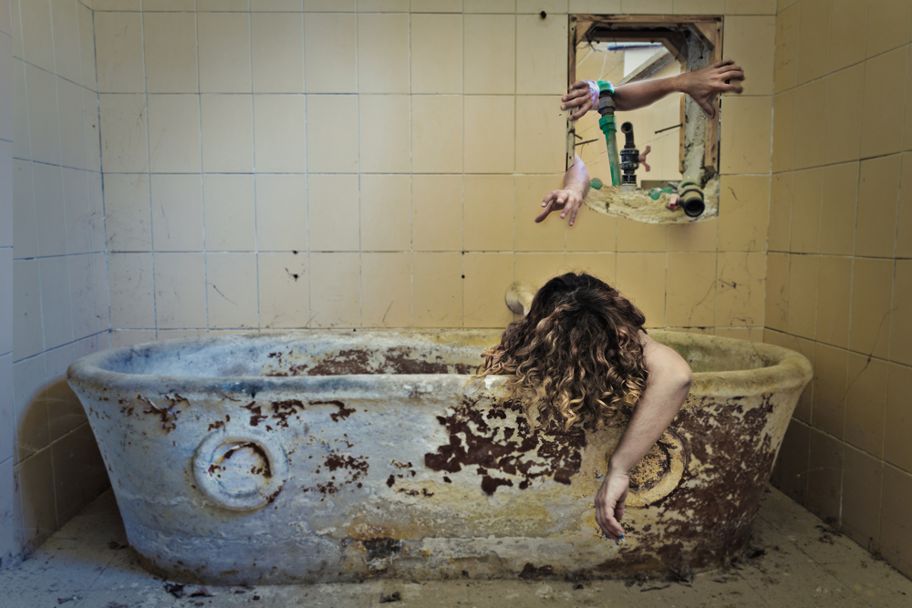Passiamo alle mani, è vero che la foto è l'unione di tre foto con le maschere si livello, ma tutte fatte in quella stessa stanza, in pratica tutto ciò che si vede nella foto e genuino in quanto rappresenta la stanza per come è veramente, anche il buco nel muro è reale, così come tubi e quant'altro.... Le mani sono le mie ho messo la macchina sul treppiede e la mia ragazza nella vasca... Poi ho fatto una serie si scatti con le mie mani in posizioni differenti e in PP ho scelto quelle che più mi piacevano e ho sovrapposto di conseguenza.