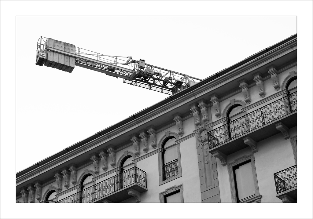 Come ha rilevato acutamente Silvano è l'aspetto riflessivo che volevo rappresentare: la scena mi è apparsa alle 20,30 di una serata molto limpida da qui il cielo nel bn, nessuna PP. Lo scatto è unico insieme ad un altro che posterò con un altro soggetto. Dalla posizione di scatto purtroppo quello che vedevo era poco più di questo, davanti a me la recinzione alta circa 2 m che isola questo vecchio quartiere di Lugano che sembra sconvolto dalle nuove costruzioni in via di esecuzione. Quindi l'angolazione "strana", inclinata, che mette ben in evidenza però la presenza della gru.