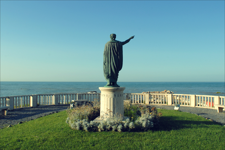 ''Lo sguardo fiero di Nerone rivolto al mare, verso l'orizzonte" non lo vediamo perchè a te giustamente interessa il mare ed il gesto visto da dietro risulta più perentorio.