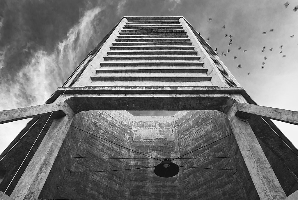 Mi piace il punto di ripresa della struttura, con l'aspetto così incombente che ne deriva; la conversione BN rende bene il suo aspetto materico ed un po' opprimente..quei pennuti in movimento ce li vedo poco, ma ho letto che invece li hai proprio cercati Wink