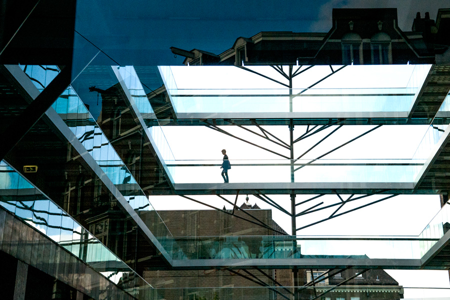 Scatto davvero bello ed intrigante , ti cattura e ti tiene incollato a cercare di scrutare questa struttura moderna impreziosita dalla figura umana , ma anche dai riflessi che raccontano lo spazio circostante .