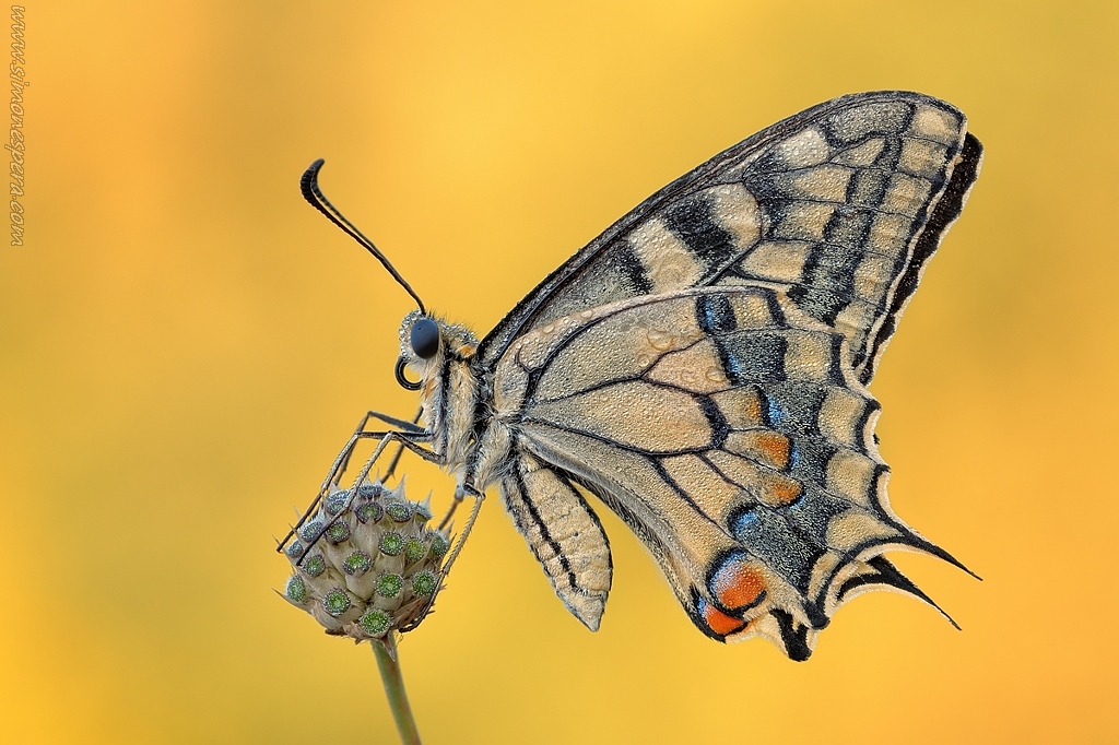 Papilio machaon (Linné 1758) Lunghezza ala anteriore 32-45 mm, distribuzione in tutta Italia. Specie termofila, si rinviene nei prati dal livello del mare al piano montano e cacuminale, sino a circa 2500 metri s.l.m. Tre generazioni annuali, con sfarfallamenti in aprile-maggio, giugno-luglio e agosto-settembre.