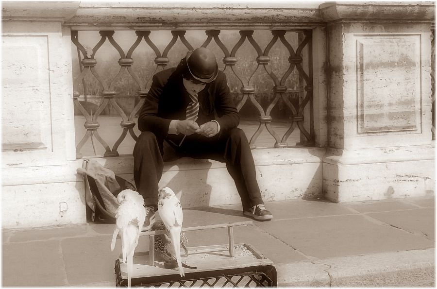 Mi pice questo Charlot con pappagalli, non so se una conversione meno retrò avrebbe reso ugalmente.