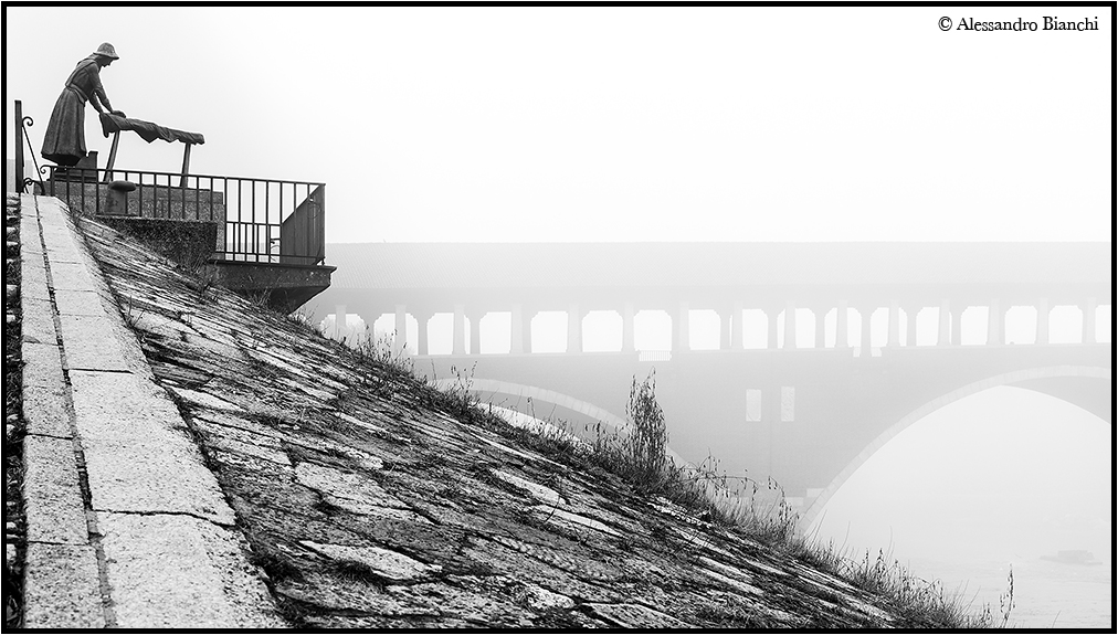 Ponte e Lavandaia, come sai, sono un'accoppiata strafotografata, in questo caso ho cercato di dargli un taglio leggermente diverso e l'iscrizione sul basamento ha corollato i miei pensieri di quella mattina tipicamente pavese.