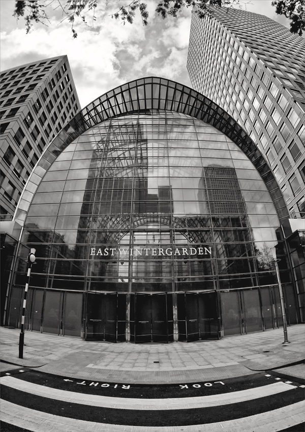 Bella perchè ha rispettato la simmetria dx sx..bella perchè ha inquadrato mantenendo una simmetria alto basso..bella perchè non si è "sbragata" in terra o in alto ma pur avendo un fish è riuscita a mantenere l'impatto architettonico dei volumi..bella perchè non ha incluso elementi di disturbo e bella perchè ha usato il b/n senza far vedere la grana e con giusto impatto "materico" vetro acciaio..