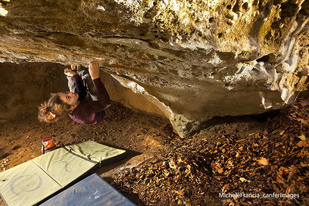 Terzo e fondamentale motivo è che qui c'erano evidenti limiti tecnici: la foto è scattata con il 16/35 su mkIII la parte esterna della grotta è illuminata da un bel sole forte pomeridiano invernale, Giorgia era in ombra schiarita da un pannello oro, a sx nel fondo della grotta ci sono 2 580 a mezza altezza che illuminano lei in backlight, i crash pads e tutta la terra in primo piano. Quindi avendo 1/200 come tempo obbligato per congelare ed essere in sinchro coi flash ho dovuto chiudere abbastanza il diaframma per poi regolare il lampo di conseguenza.