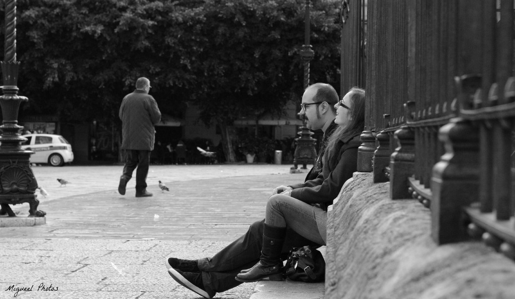 Ti avventuri frequentemente in titoli che indosso alla foto proposta appaiono forzati. Non scorgo alcun segno di domeniche bestiali qui. Solo due persone serenamente sedute in un'inquadratura alquanto dispersiva però almeno con uno sforzo di ricercare un punto di vista non il più banale. Risultato non riuscitissimo, anche per il disturbo arrecato dal lampione sullo sfondo, ma almeno un tentativo. La parte sinistra è inutile.