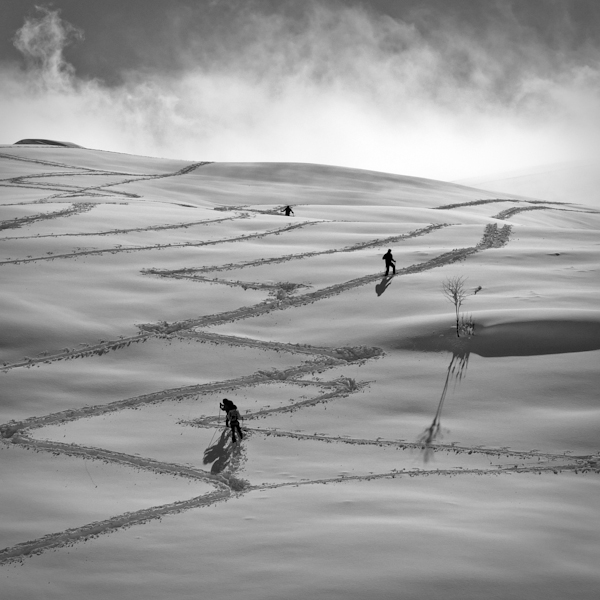 Bella composizione che diventerebbe perfetta - per i miei gusti - tagliando il piede fino a far coincidere la traccia sulla neve con lo spigolo sinistro del fotogramma.