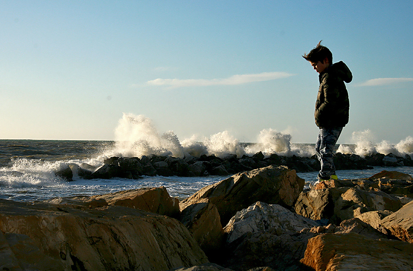Che resa dura e secca ha questo scatto. Ogni cosa ha la sua consistenza: le pietre sono pietre, il mare mare. Solo sul bambino questa durezza appare eccessiva, così da renderlo un po' pesante nei neri.