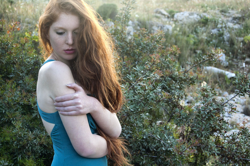 Hai una bella modella in atteggiamento sensuale e con il calore della luce che filtra tra i capelli perdendosi poi nei toni freddi di abito e verde...