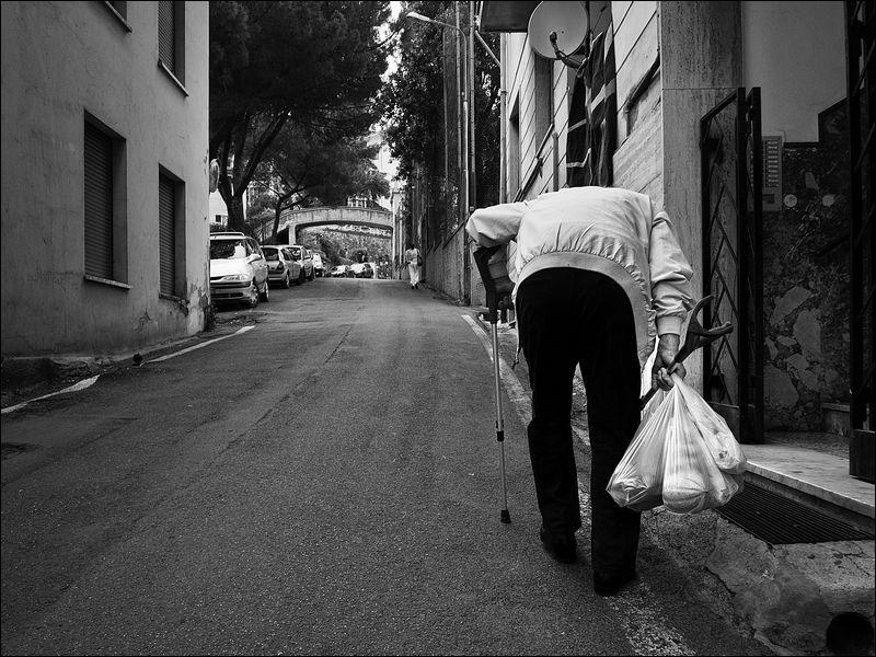 Un grande bn per un grande scatto.La salita qui oltre che reale è anche simbolica:ad una certa età tutto diventa in salita.La formidabile immagine ci parla di difficoltà,di solitudine(quella spesa faticosamente portata) ma anche di coraggio,di forza superiore a quella di tanti giovani atleti per andare avanti,sulla salita,nonostante tutto.Complimenti grandissimi e preferita! Ciao,Sergio. |