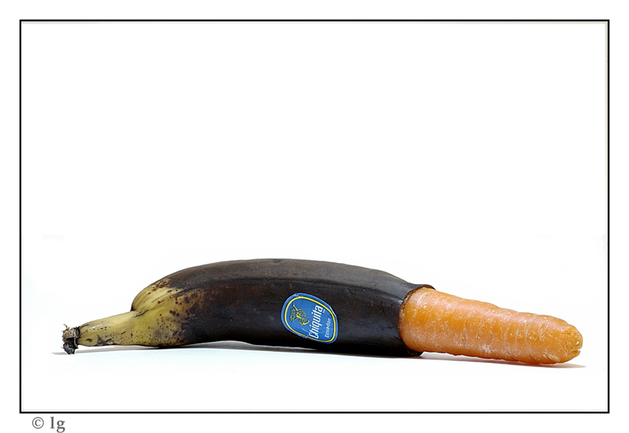 Bella idea e ben realizzata .. perchè non provare con una banana ancora degna di tale nome e magari sbucciata invece che tagliata? oppure il taglio netto aveva un particolare significato per te? un specie di guaina che la carota và a calzare?