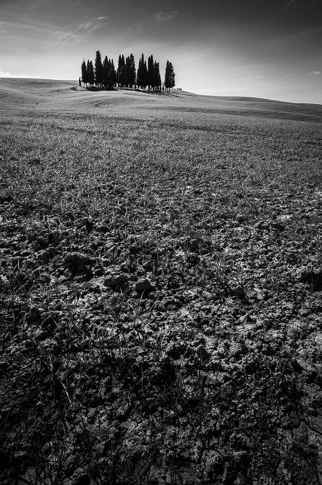 Lo stranoto manipolo di cipressi ( i più famosi d'Italia credo....) qui visto fotograficamente come un approdo a fine corsa visiva, dopo il grumi densi e screpolati della terra nuda da precorrere, che si fa forte coprotagonista. Ne esce esaltata oltre alla dolcezza della collina e dei suoi abitanti vegetali, anche la aspra e ampia solitudine del contesto. Una nota di originalità interpretativa che non è affatto scontata.