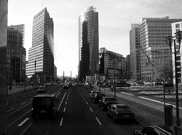 Skyline suburbana con due moderne colonne d'ercole che ne segnano l'entrata. Ti fa sentire piccolo.