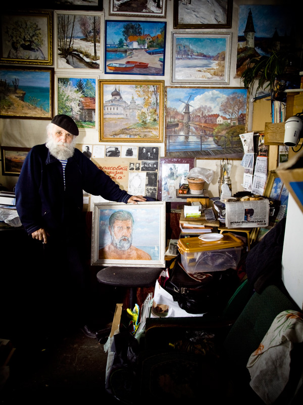 Parlando un po' in Italiano, un po' in russo e un po' in Inglese mi mostra dove vive e cosa fa per vivere: reduce di guerra, dipinge i ricordi della sua vita da marinaio in giro per il mondo.