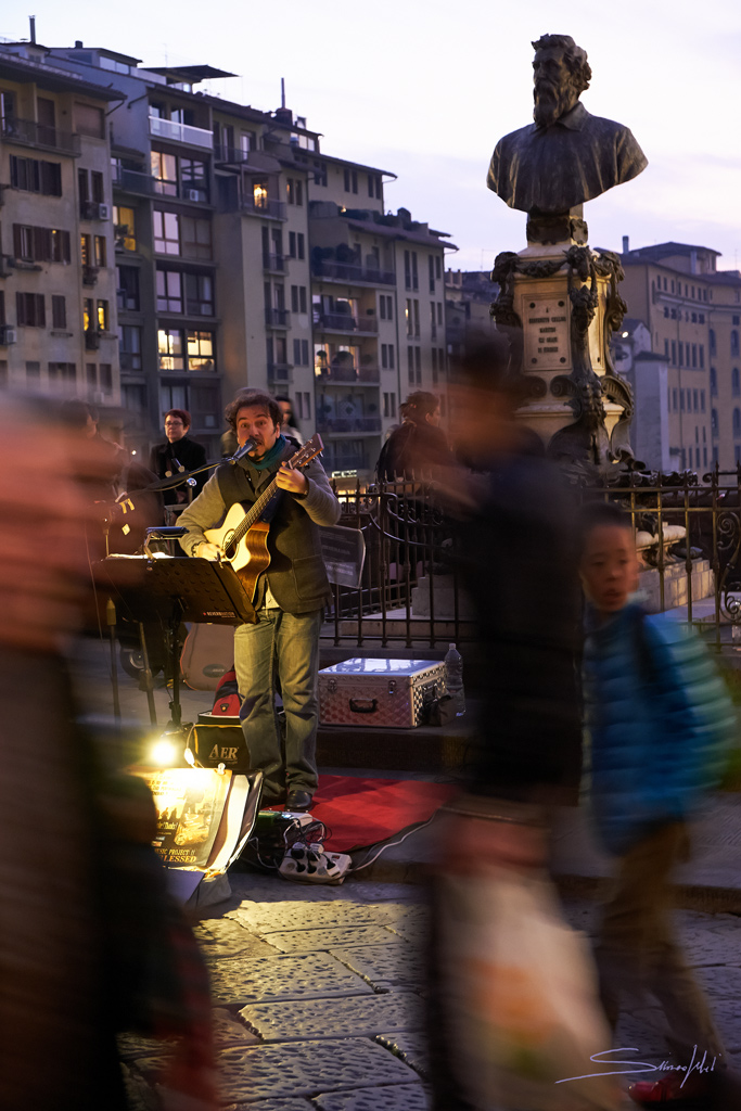 tieni una certa distanza dal centro della scena, magari ti interessava proprio catturare questo dinamicità delle persone, questo scappare via..sottolineare la dura vita dell'artista di strada, tanta arte e spesso fatta anche bene, snobbata dai più..per poi perdersi dietro a finti cantanti solo perché va di moda o perché martellati dalla pubblicità..letta cosi direi che funziona.