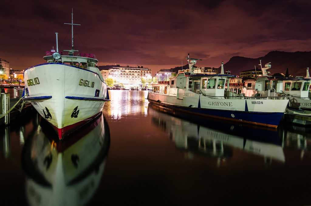 Como notturna, imbarcazioni e piazza.