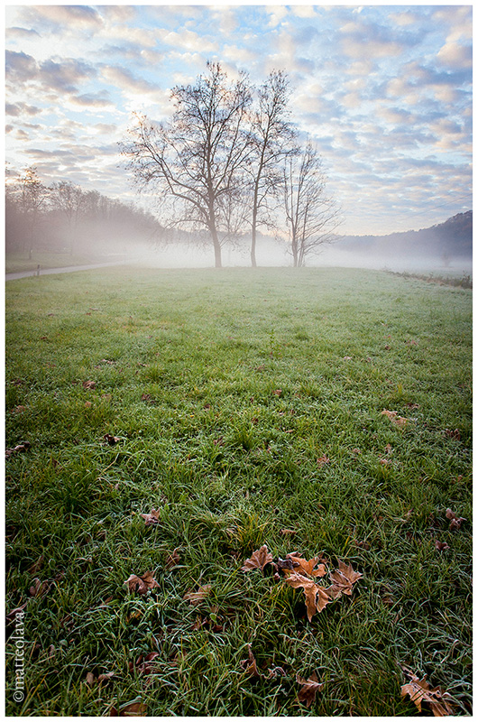 Una buona composizione con vari piani di lettura: da erba e foglie nitide in primo piano agli alberi centrali passando per la nebbiolina mattutina.