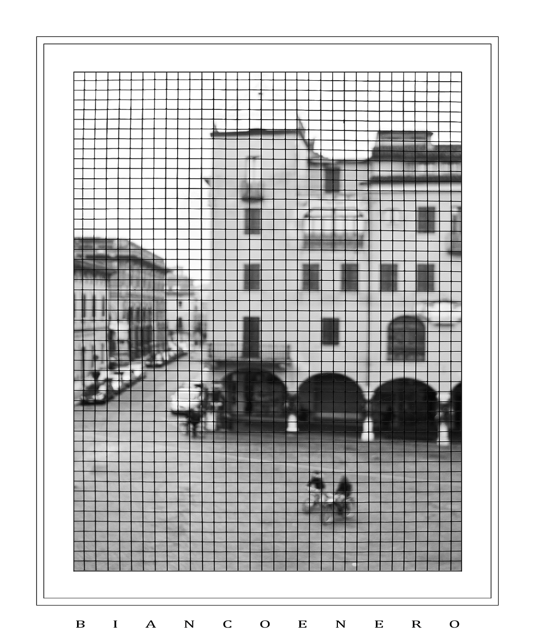 Che bella Fabio, questa visione di città, presa nella rete, vicina, ma vaga, a portata di sguardo, ma distante oltre la barriera. Una piccola sceneggiatura fotografica di un istante di città. Io solitamente sono per il colore, ma qui non c'è storia:il bianco e nero è quello che ci vuole, addirittura i due ciclisti mi sembrano risaltare al meglio.