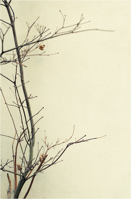 Bella Pio: anche per me c'è una richiamo, sottilissimo, al gusto orientale, ma è solo un attimo: le tinte sono quelle tue invece , quelle che ami più frequentemente, senza accensioni, anzi quasi monocromatiche, e anche i profili spogli sulla parete luminosa, veri e scritti solo dalla casualità vegetale, sono quasi una tua autocitazione di particolare paesaggistico.