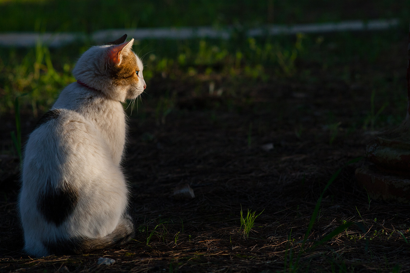 Lo spazio in penombra sulla nostra destra forse è stato composto, in così ampia misura, per invitarci a seguire la direzione dello sguardo di Dora. Però compositivamente per me è troppo ampio: proverrei una versione meno dispersiva, che si fermi dopo il bel ciuffetto di verde erba che spunta dal suolo isolata, così permettendoci di tornare volentieri a osservare il bel dettaglio luminoso sulla gattina.