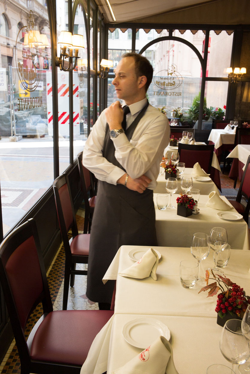 quel "forse fuori fuoco" era solamente dovuto al fatto che i bicchieri in primo piano sembrano leggermente più a fuoco di quelli posteriori e che il campo di fuoco anteriore sembra maggiore di quello posteriore. L'uso del grand'angolo è valido. Personalmente non considero sempre il mosso un errore, spesso anch'io utilizzo foto mosse, in questa foto è lo sguardo del cameriere che non è perfetto, e più che si osserva più saltano all'occhio i colori del cantiere che c'è in strada che distolgono .
