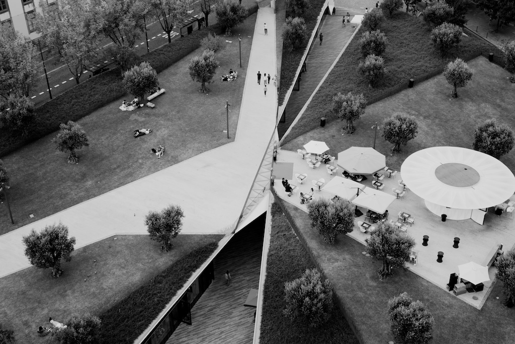mi piace questa raggiera, forse la si potrebbe leggermente ruotare per modo che la linea bassa della piattaforma cementizia dell'area bar conduca allo spigolo del frame e altrettanto porti allo spigolo del frame la staccionata di sx.