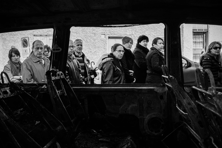Ho fatto tanti scatti, cambiavano i protagonisti, ma le espressioni erano sempre le stesse. Alcuni di loro sono venuti vicino a me e mi hanno chiesto se la vettura fosse di qualche politico e se l'incendio fosse doloso. La mia rispasta è stata "non lo so". Nei giorni successivi ho cercato anche sul giornale regionale, ma non ho trovato nulla. Spero che si sia trattato di un cortocircuito.