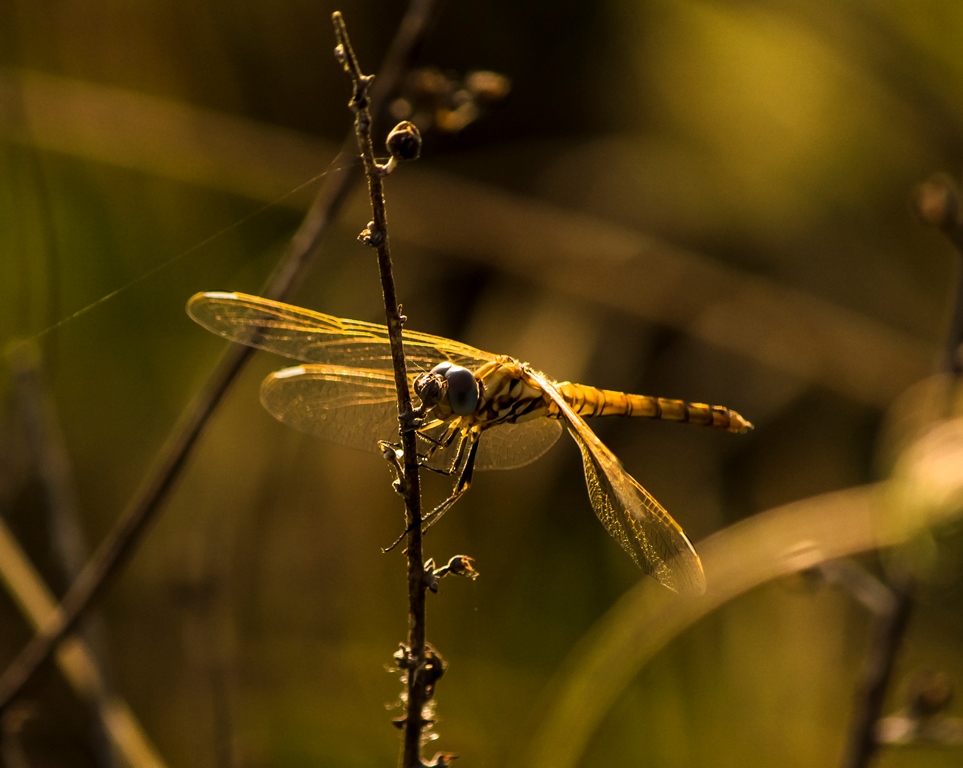 Colori accattivanti e dorati..., ma trovo nelle parole di Pierluigi il giusto commento: troppo scura e poco visibile la libellula, ed anche troppo confusa la scena, con tanti elementi di contorno che tracciano linee più o meno marcate..., ed a tal proposito mi chiedevo, è un crop? visto il diaframma aperto, e la lunghezza focale, mi aspettavo maggiore sfuocato dietro..., buona giornata.