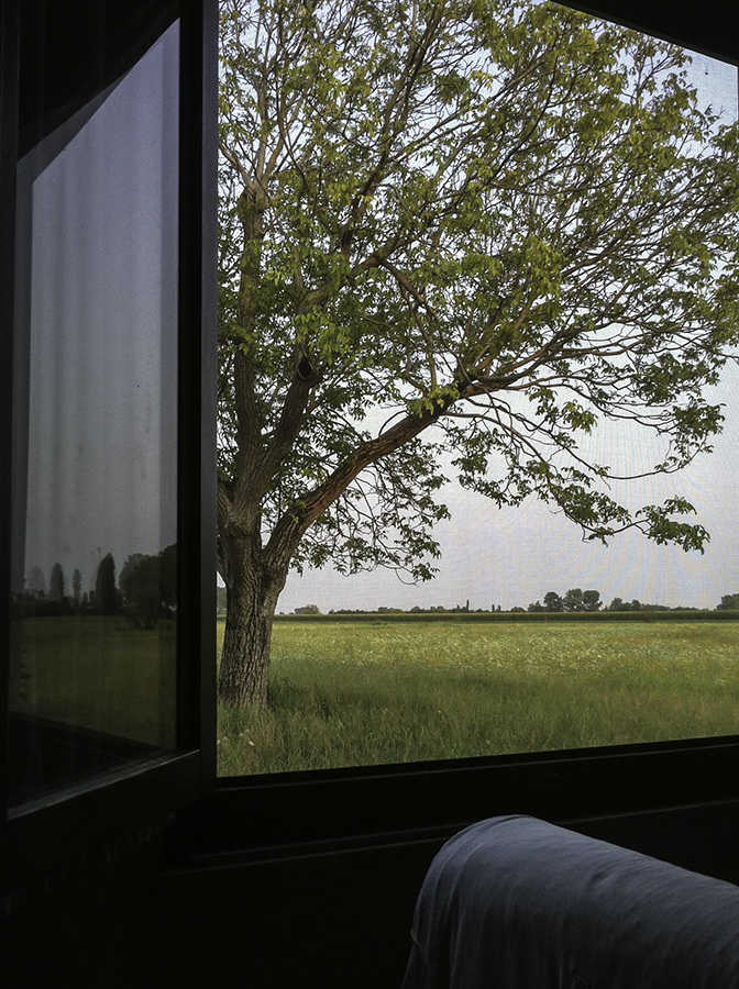 Affascinante la vista da quella finestra...quello che sembra essere uno schienale di poltrona o divano racconta di un posto speciale,di una seduta in prima fila per uno spettacolo che cambia con le stagioni.