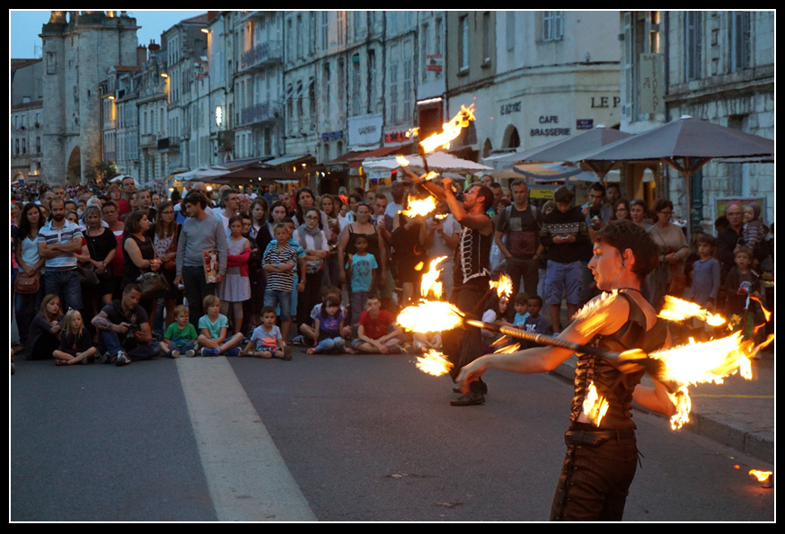 | Sinceramente avrei preferito un diaframma più aperto per staccare le persone sullo sfondo e avrei concentrato il fuoco sul o sulla prima giocoliera/o spostandola/o leggermente ma dico leggermente più verso il centro. Così non so se l'occhio si concentra sull'artista o vaga verso lo sfondo dove c'è un pubblico poi così' neanche molto attento. |