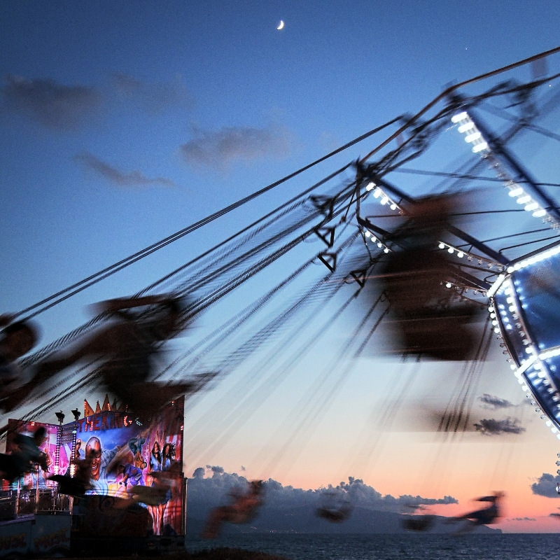In bilico fra atmosfera onirica e visione dinamica, per un giro di giostra al crepuscolo. Perfetto lo spicchio di luna centrale ed alto, mentre all'angolo la scena si colora di un bel riquadro di luci sgargianti dalla illuminazione dello stand- Molto molto carina.