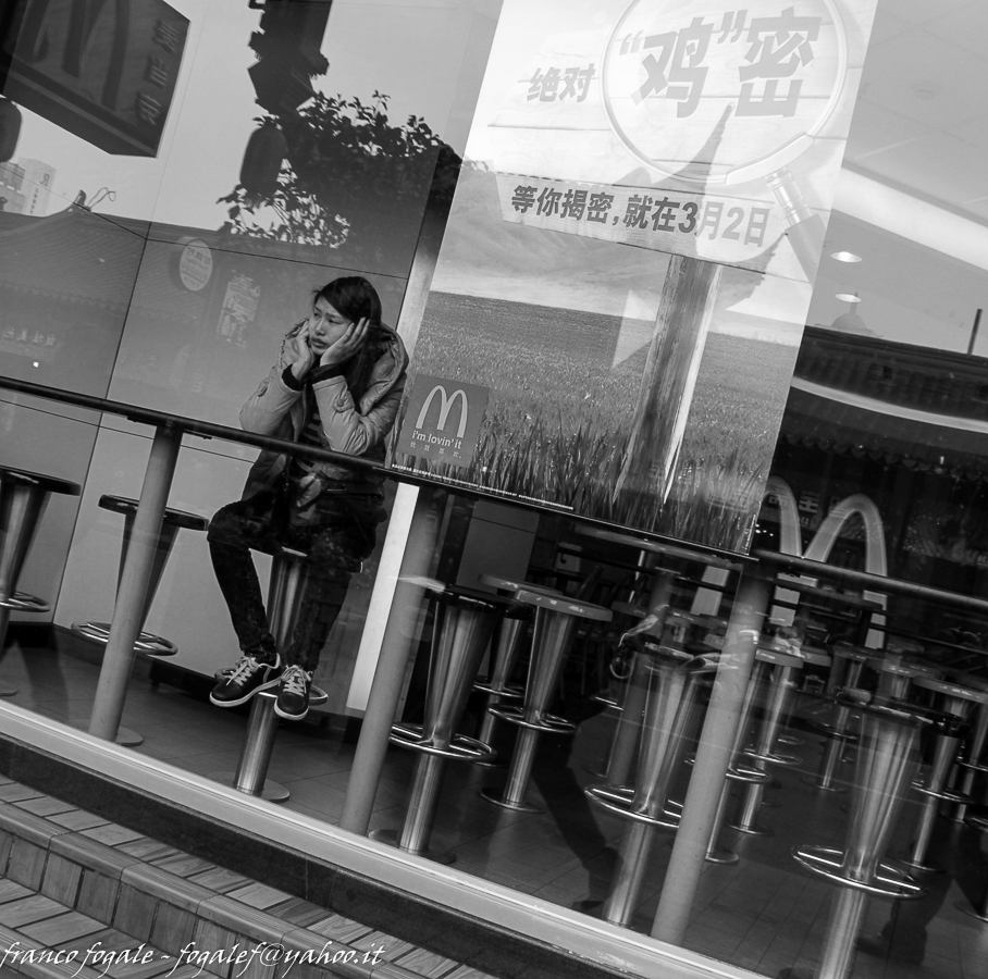Bella, piace anche a me; c'è una sorta di malinconia nel soggetto, che più che annoiato mi sembra schiacciato della quantità di oggetti proposti dalla società dei consumi di cui il MD è un emblema. A questa espressione fa da contraltare la fotografia del cartellone, che presenta un ampio spazio inquinato solo dalla invadente presenza della lettera "M"