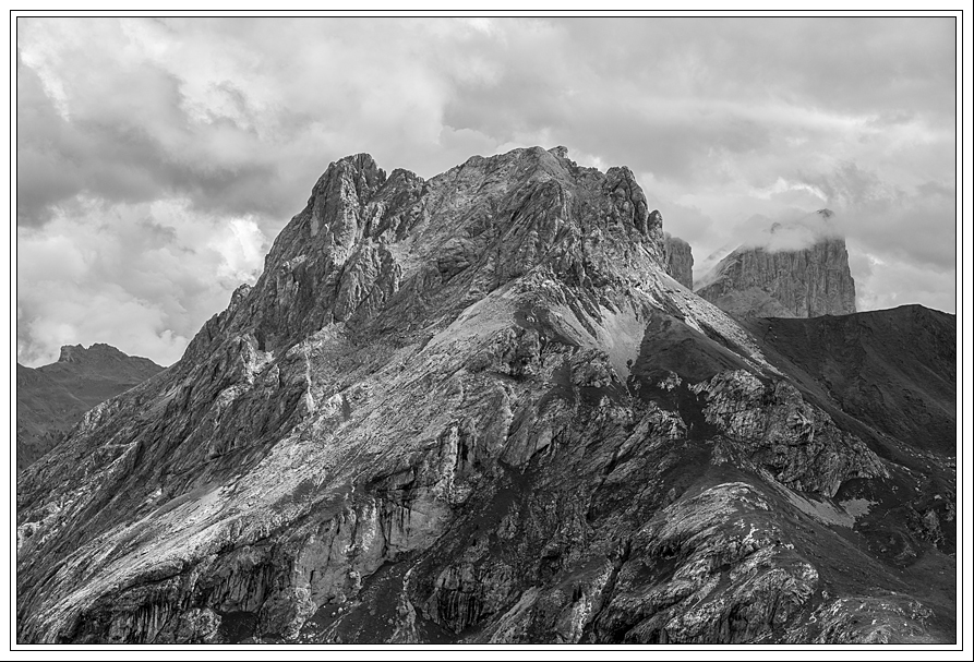 @Nicola Vicini: non credo che si tratti di un ghiacciaio... Il bianco che vedi è in realtà ghiaia. Non conosco il nome della cima, è comunque stata ripresa dal Ciampac di Canazei.